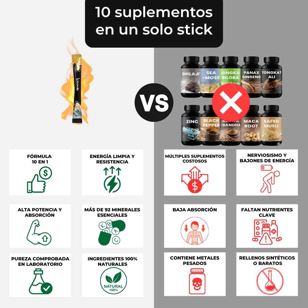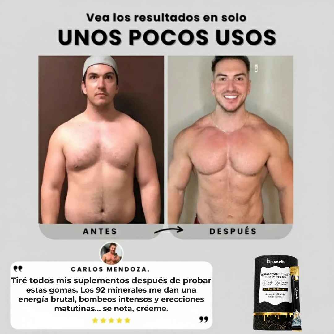 30 sobres con Shilajit Premium del Himalaya, un mineral ancestral reconocido por su poder natural. Cada sobre está formulado con Shilajit puro y bioactivo que ayuda a aumentar la energía, mejorar la vitalidad masculina, potenciar el rendimiento físico y mental, y equilibrar los niveles de testosterona de manera natural.